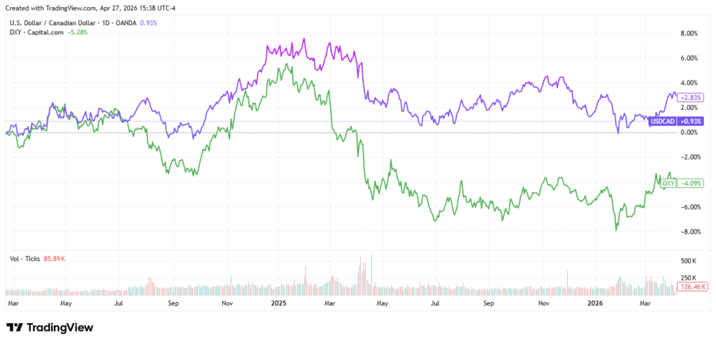Fig. 2: US Dollar Index-green and USD vs CAD-purple – 2 years – TradingView