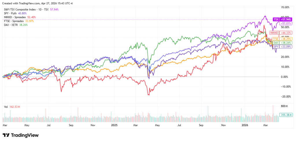 Fig. 3: Stocks: US-black, Can-purple, Jpn-red, UK-yellow, Germany-green – 2 yrs – Trading View