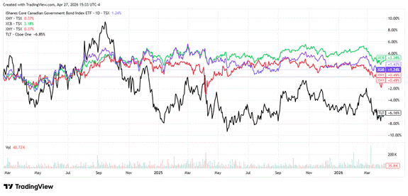 Fig. 1: Bonds-Med. term Cdn Gov’t-purple, Cdn Corp-green, High Yield-red, Long Term US-black – 2 years – TradingView